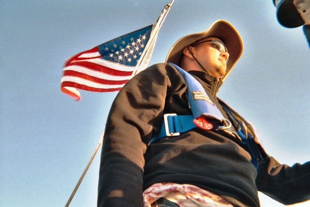 his powerful flashlight on obstructions like crab pots and floating