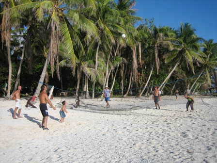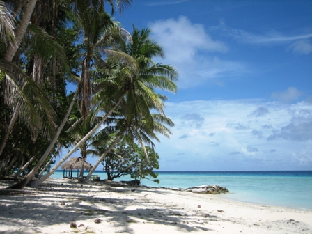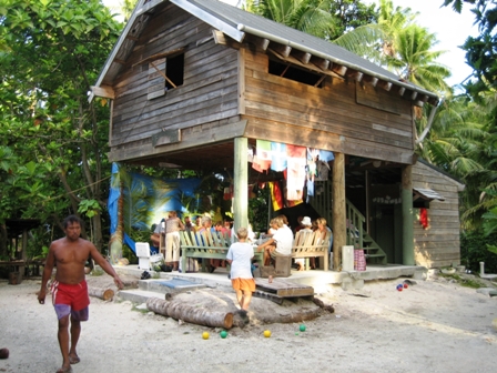 Islands (Steph) Lying at anchor at last! Our friends here were eager to hear why we had arrived in Suvorov so soon -- they all knew we had planned to go to Penrhyn first. After telling them our tale, we heard about what a treasure they had found here in Suvorov. My first priority was going for a swim. After eight days at sea, I was ready to clean up a bit and get off the dang boat! I had heard that reef sharks abound here, and was a little nervous about swimming amongst them, but my eagerness to get in the water was stronger than my trepidation. The water was a wonderful temperature (warmer than in the Societies, because we're closer to the equator here) and clear as a bell. I only saw one shark, 2-3 feet, very far away. Big deal! Once I had given the all-clear, Warren decided to jump in too. Sigh ... I wish Warren didn't make me do all the dangerous stuff. We had lunch, put the boat away, and then went on a snorkeling trip with our friends from sv Tandem. Next, a sun shower with fresh water. Showers are quite the event for those of us without a watermaker. Clean hair is a luxury, and even more appreciated after an eight-day passage! Then we went to shore to check in with the warden and for some volleyball and bocce ball with fellow cruisers. Check-in was extremely relaxed. A few other boats were checking in simultaneously, so we all sat around John's (the warden) outdoor kitchen table to fill out the paperwork while chatting. Several cruisers who had been around for a few days were making themselves at home in the open-air kitchen, and joking with John and his wife. We played games until sundown and were happy to finally lay down to a full night's sleep.