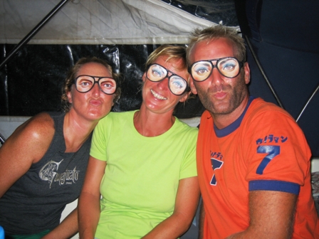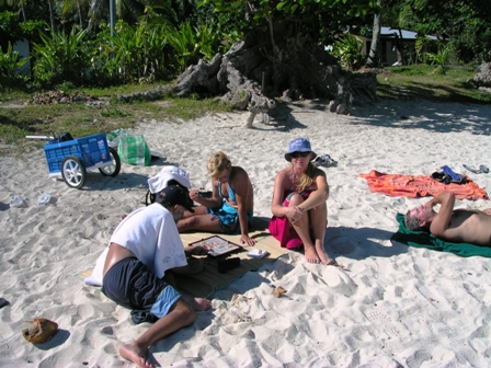 Islands (Steph) This morning we said a sad final farewell to the crew of sv Tequila. We were able to spend a couple more days (and of course nights at Bloody Mary's) together before they departed for Fiji. I'm not saying that Warren is a bad influence, but within two days of Mico leaving Tahiti, Quinn had the gearbox, generator, batteries and alternator all working again. (wojo) Hey I'm an expert at holding the flashlight. Tournesol and Novia invited us to spend a day at the beach with them. We've never hung out at the beach in the entire year we've been cruising. I guess there's a first time for everything. It was a lovely, cloudless day, with just enough breeze to keep the heat from overwhelming us. Swimming and Scrabble kept us busy for the afternoon. Later in the evening we were invited over to sv Nike for drinks. I'd been eager to meet this crew, as they're the first boat from Ireland we've seen out here. They're a lovely family from north of Dublin, with two young kids. The kids are probably the most charming kids we've ever met -- Warren described them as hypnotic. And they're also excellent bartenders! Nike also has another crew member on board, Graham from Aberdeen, Scotland. He was pretty horrified to hear I've been to Aberdeen before. He's also Tom Cruise's doppelganger.