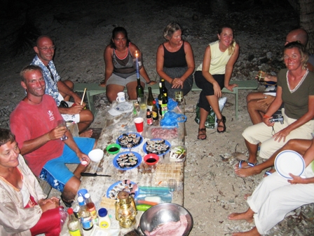 The waterfall Warren will never experience. The next day we drove our dinghy 13 short miles roundtrip to catch a sighting of the elusive stingray. These mystical creatures are quite a rarity to behold. Okay, just kidding, they're just big puppy dogs waiting for handouts. When we reached the spot, I jumped out in 4 feet of water to tie the dinghy to a rock, and about four of them came at me at top speed to see if I had any snacks. Alarmed, I tried to catapult myself back into the dinghy, but these particular stingrays are so tame that no harm could come from them. We were able to pet them as they swam up to us. A strange touch sensation -- they are buttery leather-soft, but are quite solid. No mushy flesh on these guys. They're all muscle. Sorry, we didn't get any photos. That night was date night, the first we've had in a very long time. We went out for a nice meal and enjoyed ourselves for hours over some great French cuisine.