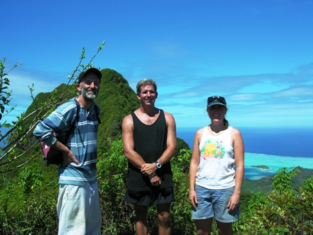Mico and Tournesol after a good night's sleep The next day, Warren and I managed to get all our administrative tasks done. We officially checked out, which basically means we are now here illegally. But officials here aren't too stringent, so most boats hang out here for a bit to wait for some good weather before heading off to points farther west. Our visas were soon due to expire, so we had to check out to avoid a fine. We also received mail from home. Hurray! Warren and I both got Teva sandals, Warren got new shorts and some tools, and we both got new DVDs. My mom told me it was our Christmas present, just a few months early. Thanks Mom and Dad! In the afternoon, we went to the Bora Bora Yacht Club for happy hour. When we chartered a boat here four years ago, we spent an afternoon at the BBYC sharing beers with friends. Then, it was a sleepy little bar with a few reeeeally drunk Frenchmen and tons of burgees hanging from the rafters. It was a pretty run-down place, but affectionately visited by cruisers the world over. At some point, it changed ownership, and now it's a posh restaurant that provides services to cruisers at a hefty price. Showers are the equivalent of $10. They also charge for water. This is the first place in all of French Polynesia we've encountered that charges for water. I guess that's Bora Bora for you. Today we got to have some fun again. Warren desperately wanted to climb Mt. Pahia, the famous peak that distinguishes the Bora Bora silhouette from all other tropical isles. Scott and Pam from Tournesol were eager to join us, and they brought with them the three crew of Novia. The seven of us enthusiastically started up the trail, chatting away. Soon we were silently concentrating on climbing up the trail, which was basically a straight line to the peak. Switchbacks were apparently a foreign idea to the original trailblazers. Roots, tree branches and outcroppings of volcanic rock were eagerly pointed out to those people in the rear as a good place to get hand holds or foot holds. In four different places along the trail, long lengths of rope had been left to aid in climbing an almost vertical stretch of rock and dirt. Three and a half hours later, four of us made the summit. Three had decided to turn back. For me, personally, it was quite a struggle to make it to the top. It was definitely the most difficult hike I've ever done. I'm not as physically fit as I used to be when I had a gym to visit regularly, but I think I still would have found it difficult then. Warren, Scott, James (from Novia), and I were triumphant.
