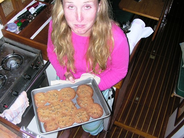Room temperature (at least 80 degrees F) butter is not working for Steph's cookies ... While on Rangiroa, I finally broke down and decided it was high time to get dive certified. After Steph's very mediocre experience at the big fancy hotel, I was a bit cautious but quickly learned about a little place right off Mico's bow called "The Six Passengers" (the name coming from the fact that they only ever have a max number of six divers per boat). I had three instructional dives in the lagoon at the gorgeous motu nuhi nuhi ("l'aquarium") and two ocean dives. The instructors were very patient and it was all on a one-to-one basis. I did have some pressure, though, as I was going through certification with the 12 year old son off a friend's boat (R Factor). He did everything perfectly and fearlessly and I actually needed a bit of remedial buoyancy lessons in the end! The ocean dives really opened my eyes to the whole other world that exists under our keel while we're out here. My first was off the Avatoru pass and was around 20 meters deep. The reef from the ocean side was spectacular and dropped off into a 1000 meter abyss at one end. My last dive is what I'd been leading up to in my instruction -- "Le grotto du requin" (aka the shark cave). It consists of being dropped off quite a ways out in the open ocean, heading down to 30 meters (100' feet), swimming with lots of big sharks and then doing a "drift dive" through Tiputa pass. Just an amazing experience ... I wish I'd had an underwater camera to capture some of things we spotted, including sharks, giant barracuda and a very up-close view of a green sea turtle munching coral. Something even more interesting thing happened at the end of my dive lessons ... One day I just finished putting away all my gear and was milling around the shop and chatting with the guys working there. I'd asked if I could do the shark cave dive later in the day but was told there weren't enough people interested yet and I'd need to wait for tomorrow's tide. As we were talking a young couple showed up and started talking to the staff in French. I immediately thought that I knew the guy from somewhere but couldn't think of where I'd have know him (and he was speaking so well that I assumed he was French). Then it hit me ... this guy was my former boss while working for Excite.com years ago in Seattle! What a coincidence! He was more than a little surprised as well. The really interesting thing was that he is a serious world traveler (as is his wife) and had definitely played a part in my epiphany (or life-wrecking event, depending on your perspective) that I wanted to see as much of the world as possible, too. They were only on the atoll for a couple of days but beers were enjoyed at the Kia Ora and they were even good enough to make the trip from Avatoru to have some afternoon wine and cheese on Mico. Guys, if you're reading this, send us an email -- we need to get together again soon -- and you've always got a berth here. All of this and I even got to do the shark cave dive with them. On Tuesday we pulled the hook, happy to get it back, and set off to the pass, at what we thought was the slack. When we were close we stopped and checked everything out with the binoculars and thought there might just be a little swell at the outer entrance. What these actually where was twelve foot rollers breaking heavily on both sides. I'll save everyone from the details but I will say that we were very close to needing much longer visas. I was also nice to know that the engine "works-real-good" at full friggin' blast (3500 RPMs). Oh well, to walk away from one of these is a blessing, especially since you learn so much in the end. We had a great sail over to Tahiti and arrived in about a day and a half, earlier than planed, so we hove to for a few hours. We entered the pass at Papeete and just as we did a ferry from Moorea blasted right by us at thirty knots inside the 200' clearance --- @#$%!. The trip through the lagoon to Maeva Beach was very pleasant however, and we had some friendly pirouges with us on our stern the whole way.