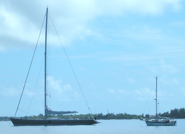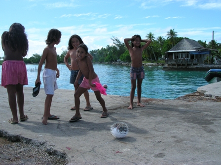 Tuamotu girls playing kickball on the quay with a puffer fish We also enjoyed the view of the anchorage. Check out the size of Mico compared to the monster sailboat. The funny thing about this picture is that Mico is closer than the big boat, so Mico is actually smaller in comparison than she appears.