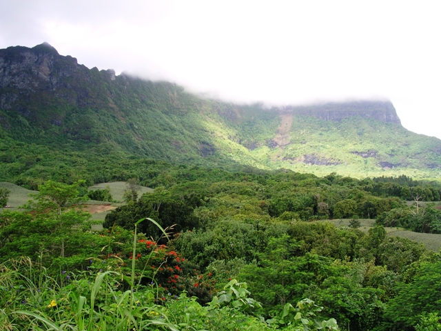 Steph and marae. This is the last marae picture we will subject you to. We circumnavigated the island and stopped at a pineapple juice factory to sample their wares. You'd think they would have plied us with pineapple juice, but instead kept a steady supply of liqueur samples coming our way. Coconut, coffee, and vanilla aperitifs were appreciated, as was "Tahiti Drink", a tropical fruit juice mixture with a good percentage of alcohol. We were a little nervous to hop back on our scooter after that, but we managed to keep upright. With an hour and a half of daylight left, I insisted that we attempt to view one of two waterfalls. Warren drove me as far on the scooter as possible, and then left me to my own devices. Apparently, riding on the back of the scooter all day is much less tiring than the driver's position. With waning light, I started my hike. I could soon see the waterfall in the distance, so steadily marched on until I made my destination. It was a lovely waterfall, although without a deep pool at the bottom. I told Warren he didn't miss anything (although to everyone else, I'll say it was a nice hike and would have been a great waterfall to stand under for a gentle, massaging shower).