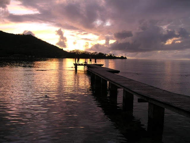 Quiet sunset in Cook's Bay This morning the boat was strangely quiet ... but we decided to check out the neighboring bay near the Club Med by dinghy. There's a narrow pass between the two bays that has some spectacular scenery but it was too wet a ride this time around for photos.