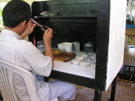 Reef walking on Rangiroa. Our next stop was a black pearl farm, where we watched pearl technicians insert little "seed pearls" into oysters. In two years, the pearls will be harvested. There are numerous pearl farms in the Tuamotus, many of them family-run. A lot of cruisers like to trade stuff for the reject pearls that don't meet market standards. On Rangiroa, at least at this savvy farm, that's not an option. So we paid cash for a few pearls, but at much lower prices than we'll reportedly find in Tahiti.