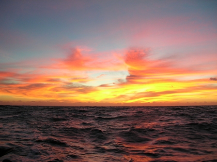 Sunrise on passage as the seas build We arrived off Manihi about two hours after slack water and with an overcast sky and strong winds we decided to heave to for the night and try again the next day. Let me back up a second ... to navigate "safely" through an atoll pass in the Tuamotus you need good light (an hour or two before/after meridian passage for your longitude), slack water since the ebb can run nine knots, a good lookout as high as possible and a bit of luck. The next morning, beginning to feel a little frustrated we joked about just speeding on in these conditions to Tahiti, but the thought of completely skipping an island group made us even more weary. We were now five days into a long passage and feeling a little worn. Determined to get into Manihi that day we started to beat up the channel between Ahe and Manihi and were thoroughly bashed. The wind really started to pick up and seas built such that even though we made it all the way down the channel, when we were even with the Manihi pass we decided to jibe and headed back out. We were now feeling very skunked and the weather was not improving. From our position near Manihi it was eightly miles to Rangiroa, a very large atoll at the very western edge of the group and we decided to give it a shot hoping that by the time we made it there conditions may have improved enough to get inside. I don't recall exactly how long it took us to get to Rangiroa that night but I do recall Mico making ten knots down some big waves in thirty knots of wind. I was having the time of my life sailing out there! However, Steph as the usual voice of reason suggested that we be a little more conservative and pull in the big genoa and head downwind with double reefed main and stays'il. I was having too much fun to want to reduce canvas and we paid the price. Finally conditions built enough that I was convinced we needed to reef a bit more deeply and we immediately noticed that we blown the foot out of the genny ... ergh. And to think that we still made six knots with the Hasse stays'il with an easy sail. That foot needed to be replaced soon anyway, right (and now we have an excuse to get the foot line sewn in to stop the flutter that blew it out anyway). Early the next morning we were on station near Tiputa pass at Rangiroa (Rangi) but we still didn't feel good about heading in ... We decided to give it a day or so, headed out a little farther and once again hove-to to wait. Before this passage we'd only hove-to with Mico once -- and in Puget Sound -- while having dinner with our friends Jeff and Michele! Well it's a good thing that Larry and Lin Pardey have such good diagrams and instructions in their Storm Tactics book. It took some experimentation, but Mico hove-to beautifully, producing a good slick, just by dropping the headsail and setting the tiller about twenty degrees to leeward. The day hove-to was actually pretty comfortable. We lounged around in the big seas and hoped for the best. At one point I'd been playing with the tiller shock cords a bit and headed us down wind a little too much, causing us to lose our slick and forereach and went below. Within about five minutes Mico was struck by the biggest wave she's ever taken on. There had been only whitehorses all day that I'd seen and no overhanging (breaking), dangerous waves but this one was definitely an exception, bordering on "freak" wave. The wave broke completely over the top sides of the boat and water gushed in through the closed hatches. I don't even want to think about how much water would have been below had we had our usual arrangement employed with all hatches open, including the companionway. After the big wave we resumed our proper hove-to position and never had another worry. The next day (day seven of a once four-day passage) we woke at 0400 to beat the thirty miles back to the atoll to get back on station for the slack tide at 1130. We arrived at Avatoru pass (the secondary pass for the atoll which is west of Tiputa pass) within ten minutes of our predicated slack, cinched up our undies and went for it. Steph was on the bowsprit (she has terrific eyesight) and guided us between the reefs and markers in fine style. Due to all the water blasting through the passes the previous days we didn't have quite slack water with about a one and a half knot ebb, not bad. There were all sorts of small standing waves, rips, eddies and slicks on the way in and it was the most exciting ten minutes we've ever had -- a very real, tangible sensation of "What next?" The colors around the pass were spectacular and I've never seen anything like them. Even with the sun behind a passing cloud "eyeball" navigation was still fairly strong through the lagoon. After turning east through the pass we beat three miles up the lagoon to a good anchorage, sheltered from the SE trades, off the Kia Ora hotel in the bight. We poked around a little trying to spot coral heads that might snag the rode and settled down on the hook. What a relief ... We even managed to get the boat put away within a couple of hours. Our friends from sv Bianca were next door and were kind enough to ferry us over to the hotel bar for some much needed cold drinks (we didn't manage to get Bonobo in the water yet). ... What a difference a day makes ... The fax for the next day had predicted less than five knots of wind and we, needless to say, were somewhat skeptical. But it was completely spot on and thus began a truly perfect day in the South Pacific. After breakfast we fired up Bonobo and headed over to "the aquarium" off a motu near Tiputa pass which was reputed by the dive shops as some of the best skin diving on the atoll. There are even moorings to take as to not damage the live coral with your dink anchor. As soon as Steph was over the side of the dink she surfaced again quickly and yelled "This is amazing!!" The reef was stunning and I've never before seen so much marine life variety. The next item on the day's agenda was to 