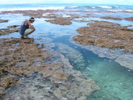 Hey, the view is the same for us both. (wojo: yeah, we get goin' real good if you rev us up on carpet a few times) After lunch, as we rode along, the lagoon on one side, the reef and the open ocean on the other, we realized it was just about slack tide. The reef walking that Warren had been so keen on the day before might actually have some merit -- it being the lowest of low tide, before the flood, the reef was exposed for about a quarter mile out to sea. The day before, we had tried walking on a tiny bit of exposed reef and just got really wet. Today, I could finally see the appeal of reef walking at the right time. Under the surface, where the reef hadn't been exposed, life was going on as it always does -- fish a-swimmin', crabs a-crawlin'.