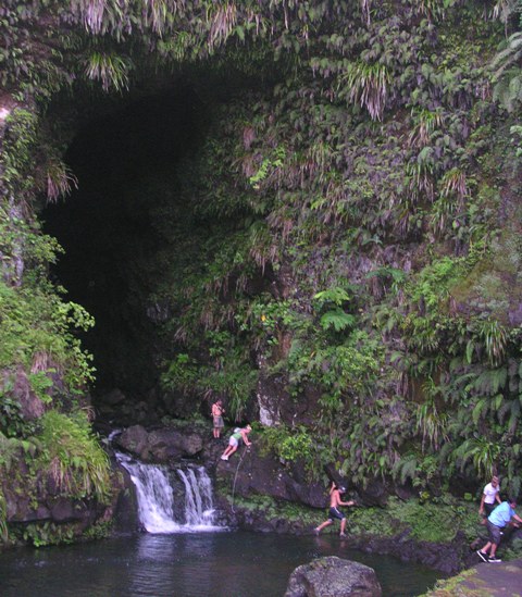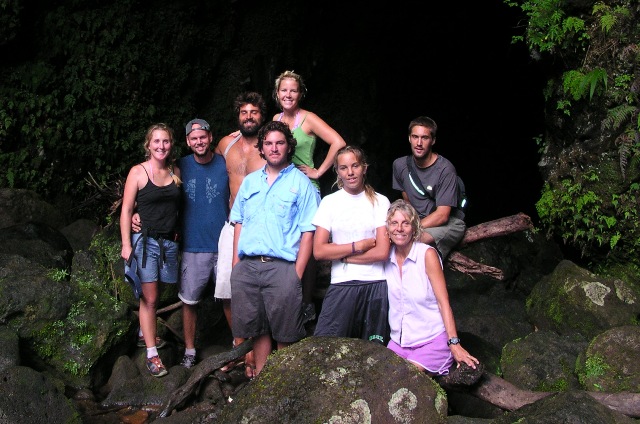 Islands (Steph) Almost back to the business of cruising. We've spent about two weeks here in Papeete. About a week longer than we'd originally hoped, but it's no surprise. After two days of sulking and stressing out that we were not making progress on our various boat projects, I finally took a cue from the skipper and decided to have some fun, too. Most of our time here has been spent shopping, hanging out with our friends on Tequila, seeing the local sights, and eating fast food. But, with only four weeks left on our visas, it's time to get cracking. Today, Warren further investigated the ongoing hot-engine problem. Having finished most of the projects on my list (ahem), I was elected to go on a hunt for some new hose for the heat exchanger. My journey today was a small-scale version of the hunt for the sail in the Mexican postal system, except I speak a total of about 30 words in French. But, I got the hose for free, so I guess I can't complain. When you can't get out of McDonald's for less than $20, you realize how difficult it is to come by free stuff around here. Yesterday, our last official day of slacking off, we rented a 4WD car with the crews of Tequila and Dr. John. We went off in search of some lava tubes (geology lesson of the day: lava tubes are formed when a river of lava cools off on the outside, but continues to flow on the inside. Eventually, the flow of lava tapers off, leaving a hollow inside the cooled-off outer layer). After a lovely drive around the northern edge of the island, we got to do some serious mud-slingin', rock-climbin', and tailbone-crunchin' 4-wheel-drivin'. After a few tries down dead-end roads, we found our lava tubes. We hiked through the lava tubes, along a small river. Gorgeous scenery and fun rock-scrambling.