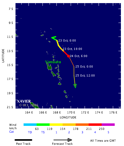 Bellevue, Washington Vanuatu to Australia Cyclone - part 1 As anyone who was in the southern hemisphere this past year is well aware of there was an El Nino weather pattern in effect. It’s not all academic bluster and real events do happen because of it. What kind of things happen you ask? The only answer I can give you is – strange ones and things you do not want to happen to you. After two of some of the best weeks of cruising we’ve ever experienced we arrived in Luganville, Espirto Santo on Friday the 20th of Oct (2006). Most of the yachting fleet had been scared out of the tropics at this point since the official cyclone season was less than two weeks away. We were happy to find plenty of open mooring buoys as we rounded the bay in front of the Aori resort. The main anchorage in Luganville is notoriously raucous since it is nearly completely exposed to the trade winds and swells. After picking up a ball with no trouble we dinghied into the beach and had a nice siesta the usual bar suspects. There were four yachts assembled in the bay, like us they were all participating in the Port2Port rally from Luganville, Vanuatu to Bundaberg, Australia. This is a yearly rally sponsored by the Port Bundaberg Marina that promises a “gentler” passage from tropics to tropics in contrast to the long Southerly slog across the mighty Tasman to Sydney or the even more perilous journey to New Zealand. For at least the preceding ten days I had been tracking a tropical disturbance near the equator that was moving south. From looking at the pilot charts I knew that this was something to keep a weather eye on since this was getting to be the time when little blips like this can turn into big problems. Other yachties had been tracking this low as well and we talked about what might happen in the next couple of days. The next day we completed our water, provisioning and check-out formalities in Luganville. I was able to get online at a local Internet café in the “downtown” area of the village and look into the next week’s weather in greater detail. I am a huge fan of the site the US Navy Meteorological team maintains for their own fleet; it also has a public access component. The models they use are not only some of the most accurate I’ve found they also have some of the longest lead times – at nearly seven days – where NOAA, although very accurate extends to only 72 hours. The Navy confirmed that something was indeed happening near the Solomon islands group and was moving quickly South to our latitude. The winds in our area were expected to increase in speed to 30-35 knots within 48 hours. On top of that, due to a “squash zone” being created between the low and a high pressure system further South the seas would start piling up into the 15-20 foot range.