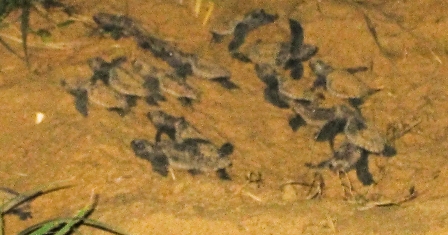 Knowing all this, it was an amazing experience to see these little turtles bursting forth from the sand and making their way down to the ocean. They were about the size of a deck of cards, fins and all. As they came forth from the sand, the rangers gathered them into a pen. The rangers swept away sand from the underground nest, helping the tiny hatchlings surface faster.