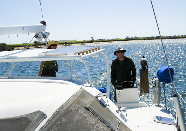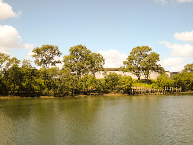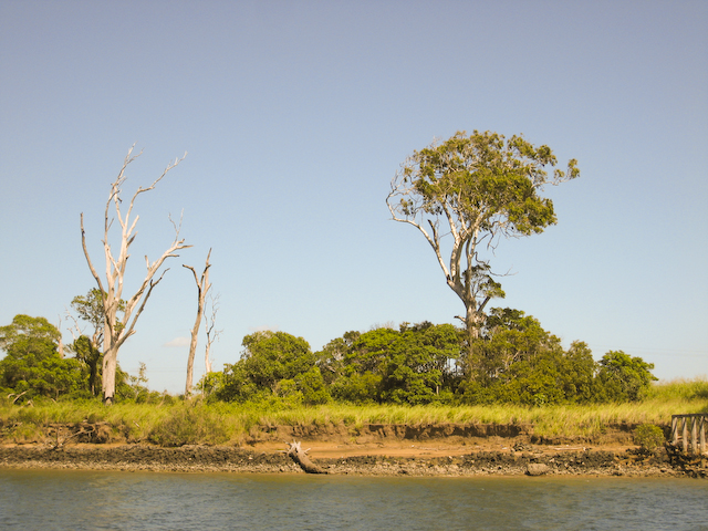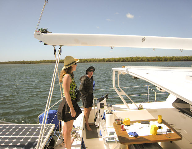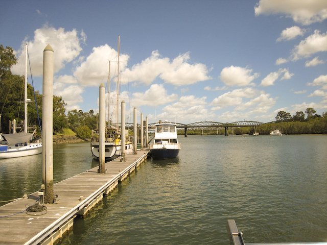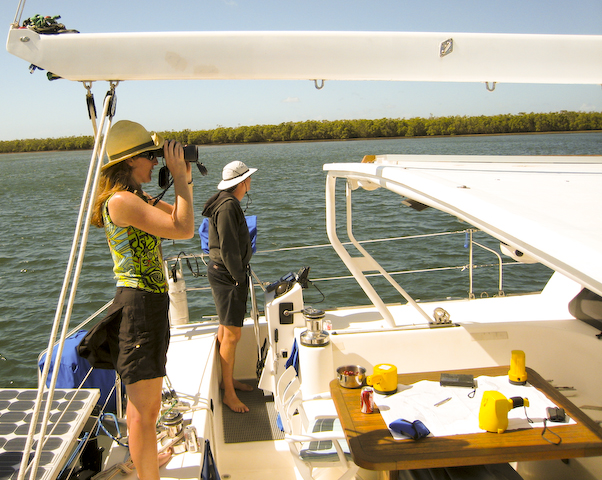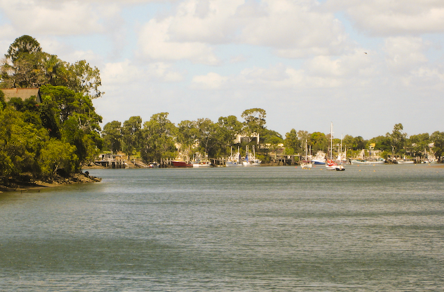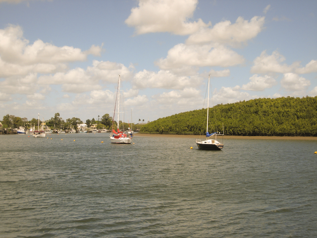 Australia We sold ourselves up the river today. Our friend Richard from Mystic Rhythms (Catana catmaran) was headed up nine miles to haul out at the larger yard in downtown Bundy. We were very happy to come along and enjoy his yacht for the morning. The trip was pretty uneventful overall only two buoys had us stumped and exclaiming - "... they expect us to completely turn around to make that turn?!" Even at low tide when we transited we always had at least six feet of water.