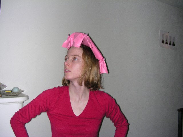 Alissa models her chamber maid-style hat. (In pink, of course.)