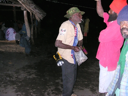 Port Resolution, Tanna, Vanuatu (Steph) Tanna is headquarters for the Jon Frum Movement, aka a cargo cult. Having heard about this cultural phenomenon, we couldn't pass up an opportunity to watch the people in action. The background of this cult is that during World War II, the U.S. military used Vanuatu as part of its defense strategy against Japan. Upon seeing all the stuff that the U.S. army had -- airplanes, trucks, radios, Coca Cola -- some of the local Vanuatans decided that all of this must be a gift from a god. After the military departed, they started worshipping a god-like figure they named Jon Frum, who supposedly will descend someday from the sky with a lot of stuff for them. I'm sure I am over-simplifying this a bit, but I don't have a lot of information about the cult at my disposal. If you want to know more, try Wikipedia. You're the one with Internet access! There are various Jon Frum villages around the island. Their Friday night ritual is to dance and sing from dusk till dawn. Singing and guitar groups from around the island travel every Friday to participate. Warren and I were given a ride to the village around 10 pm and the ritual was in full swing. The current band sits in a clump in the middle of an open meeting house, while some spectators sit and watch around the edges of the house. Around the building, people dance wearing brightly colored grass skirts over their every day clothing. One older gentleman wore the costume of an American WWII soldier. The village bands alternate the stage every 20 minutes or so, with complete silence between songs and between sets. During the silence, we could hear the eerie explosions of Mt. Yasur, which overlooks the village. The music they play is all in the same three chords, and the rhythm of each song is so similar that it was hard for us to distinguish the differences between each one. But reportedly they sing about how good it will be when Jon Frum arrives, and how much better life is if everyone stays in the village. A Peace Corps worker we've met told us that he thinks the movement is dying out a bit with the younger people, at least the spiritual side of it. But they still like to participate in the dancing and singing, because hey -- what else is going on Friday night?