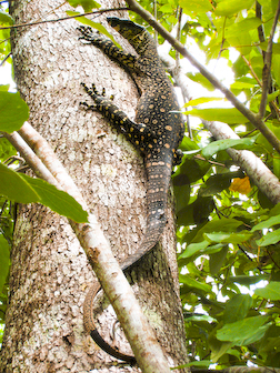 Island, Cumberland Group (Steph) Well, we finally made it to the island of Whitsunday, centerpoint of the fabled Whitsunday Islands. Many of our cruising friends have plans to blow by the Whitsundays because they are reportedly full of charter boats, local Australian cruisers who drop the hook for an entire season, and resorts. But we've arrived at a great time of year and it's easy to avoid the islands with resorts. We've had a great time. Within 30 minutes of dropping the hook in Cyd Harbor, another cruiser zoomed over on his dinghy and invited us over for dinner later that night. We looked towards the boat he was indicating as his own -- it was a great, big power catamaran. Wow, we've never been invited aboard a power boat before! Cool! Now, we would get to see how the other half lives. Buddy and Bev live aboard mv Sea Eagle, a catamaran they had built a few years ago. It's beautiful and a great place to call home. I drooled over Bev's full-size refrigerator and freezer, just like the ones I've enjoyed on land. They live on the hook most of the year, collecting hundreds of gallons of rainwater (the locals call the Whitsundays the "Wetsundays") and getting most of their power from solar panels. They run the generator when they have to use a heavy-duty energy-drawing appliance, like the washing machine. Just, don't. Say. Anything. It seems that they also rarely have to pull into a port because Buddy is an accomplished fisherman who has figured out the haunts of all the local delicacies. We were lucky enough to be treated to fresh oysters, harvested only an hour before dinner. We were shown Buddy's jail cell of crab he's caught, which he calls Alcatraz. I guess Bev just pulls one out every other day for lunch. We had a great evening with them and were honored to have been chosen for one of their invitations -- while it seems we get on with most cruisers, it's rare we meet a crew that is so driven to meet so many new people and to be so outgoing. While on Whitsunday, we had hoped to hike up to Whitsunday peak, but the trail we found seemed to be very overgrown and go straight up the mountain. Having been spoiled with the excellent trails we've encountered in other Australian parks, we decided not to start bushwacking now. We had lunch at a little picnic area, where someone had told us we might see goanas, big lizards that are 2-3 feet long and look like miniature monitor lizards. After lunch, Warren got up from our picnic table and announced he was going to go looking for goanas. He took two steps and saw one slinking out of a nest, looking like he had just enjoyed a few birds' eggs. We followed him around for a bit until we realized we were surrounded by goanas. There were at least five within our view. It started to feel a little spooky, but I think most of them were just looking for little spots of sunlight in which to bask. We spent two nights in Whitsunday, and then moved on to Hook Island.