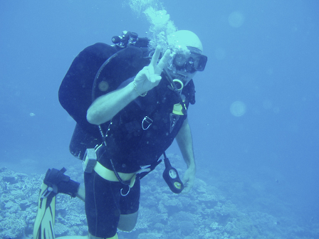Townsville to Lizard Island (Steph) We sailed overnight to Fitzroy Island where we took the new/old outboard to shore. We reunited with our friends from Beyond and shared cold drinks at the small bar there. Then it was back to the boat to prepare for the next day's departure for Lizard Island, where we hoped to catch up with some of our other friends. A lovely day and night of sailing followed. We were traveling in the shipping lanes, which was terrifying but unavoidable in the reef-strewn Coral Sea. When we see ships approach, we always try to hail them on the radio to make sure they are aware of our presence. Very rarely do they respond, and usually the next 30 minutes are spent in sweaty, fearful anticipation while we find out whether we have to change course to avoid their thundering advance. But here, in the extremely narrow shipping lanes between coral reefs, even the big ships are nervous, so everyone responded to our radio calls. For being pretty high traffic, it was pretty low stress. We arrived at Lizard Island and quickly put the boat away. We had managed to finally catch up with our friends on Mystic Rhythms and Moose. We were just in time, because Richard, on Mystic Rhythms, is an avid diver and was coordinating a trip out to the Great Barrier Reef for the next morning. He invited us along, for which we were extremely grateful -- we weren't willing to take Mico so close to the reef, but if it's someone else's boat, well then sure, count us in! It was actually a once-in-a-lifetime chance; we hadn't been sure we'd actually get to snorkel or dive on the Great Barrier Reef while here in Australia, despite its proximity. We set out the next morning for a spot called the Cod Hole, named for enormous potato cod that inhabit the area, with nine of us in company. We arrived at the reef with everyone biting their nails, but Richard expertly handled his boat and we were soon comfortably tied off on a mooring. Warren and I were planning on snorkeling because we don't have any dive gear, so while everyone else was getting all their gear together, we jumped in and started exploring. The snorkeling was spectacular, and we spent about 45 minutes exploring the walls of the reef and little crevices and caves within (from above, of course). We went back aboard the boat for a rest, and were offered the use of others' dive gear. What an opportunity! With gear donated from a number of friends, we jumped back in and got to see the reef from a different perspective -- right down in it! Richard took pictures that he has allowed us to share.