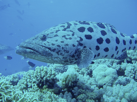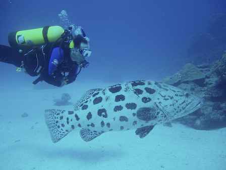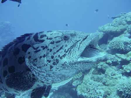 One of the potato cod that make the Cod Hole famous. They are very curious and are not shy. They let us pet them