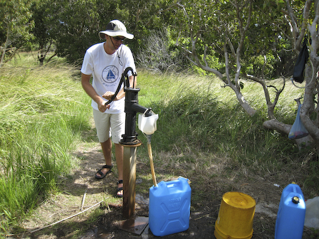 Getting shower water from the only fresh water source (available to cruisers, anyway)